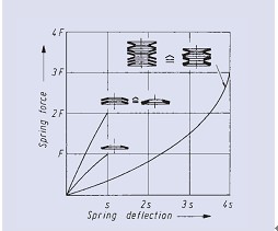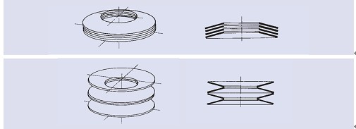 可以通過將由不同片數(shù)碟型彈簧組成疊合組合彈簧或不同厚度的單片碟型彈簧組合成碟型彈簧組來獲得遞增的載荷特性曲線,在這種情況下,彈簧組達(dá)到壓平位置或極限行程后,單片彈簧或組合彈簧將不再對彈簧的變形量產(chǎn)生影響。