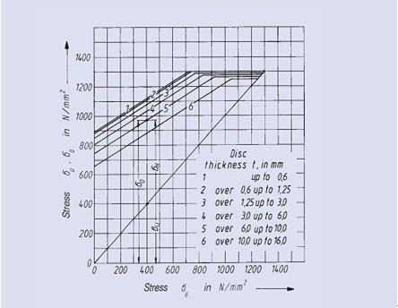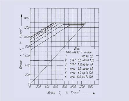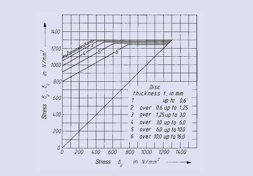 以下所示疲勞強(qiáng)度圖的獲得基于Mubea對(duì)碟型彈簧多年的測(cè)試結(jié)果。這些結(jié)果中所示為決定碟型彈簧疲勞壽命的下表面許用計(jì)算應(yīng)力。疲勞強(qiáng)度圖也對(duì)不同彈簧的尺寸、厚度以及載荷循